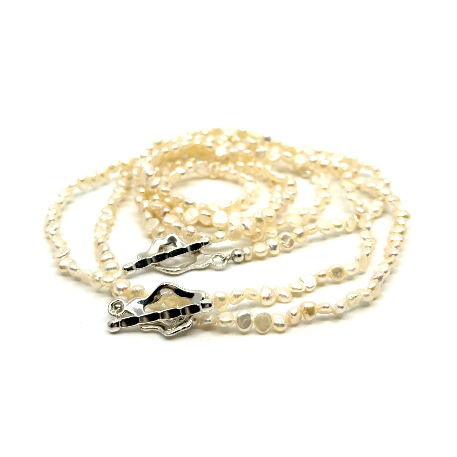 Lange ketting met mini parels en organische vorm sluiting zilver